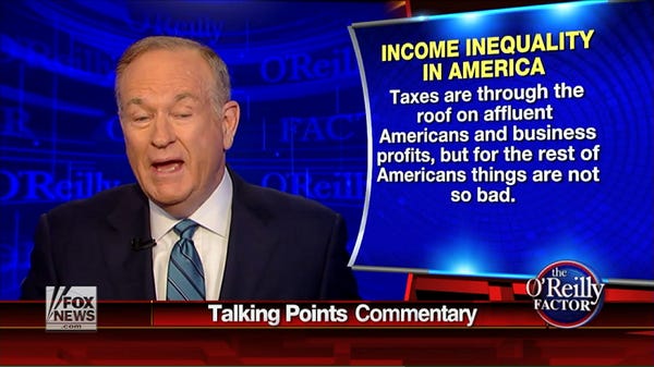 Oh look, Bill O'Reilly is protecting the rich again! You will be very surprised to learn that in a Monday segment that was ostensibly about "income inequality in America," O'Reilly explained that the real inequality in America is all abouthow tough the rich have it, while those who aren't millionaires are just living it up all the time, having a big party at the expense of oppressed rich people. It's really an impressive bit of bullshitting, and you can bet that a lot of Fox viewers will take a moment out of their second or third jobs to sympathize with the plight of those making 300 times as much as they do.