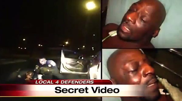 WDIV Detroit obtained the video, which the town "somehow" failed to turn over to Dent's attorney. The tape seems to show officers wiping Dent's blood off their persons, and joking and "pounding fists" in bro-tastic celebration, while one cop stages a "hilarious" re-enactment of the beating. This bit of theater results in a much needed laugh for everyone in the room except the injured Dent. There's no audio with the video, so maybe they were giggling about an old Jay Leno monologue. Maybe they were chortling at the officer's depiction of a scene from the department's favorite Oscar Wilde play. Maybe they were LOL'ing about how stupid Melendez was for allegedly planting crack cocaine on a man with no criminal record (while on video) who would end up testing negative for drugs. In any event, the laughter is real and taking place mere feet away from Dent, who claims all of this happened before the police called an ambulance to treat his broken ribs and orbital fracture.