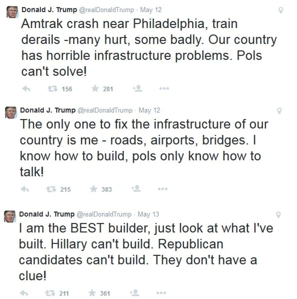 One Great Mind on the right, Donald Trump, appeared at first not to have gotten the message that infrastructure had nothing to do with the deaths of seven people; his first reaction to the deadly crash was to brag about what a great job he'd do fixing up everything, because he is a guy who builds yooge classy things: