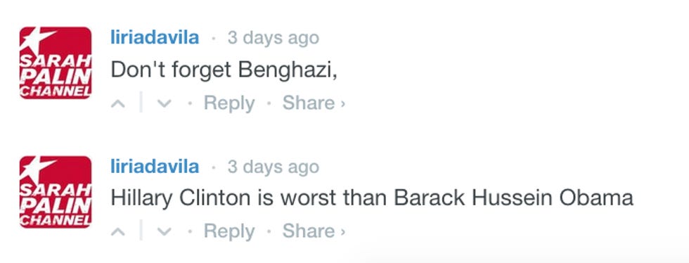 One of the videos is titled "Who Will Take On VA Reform?", and all of the commenters are like "YOU SARAH, OBVI." It's really boring and we're not going to cover it. Instead, let's observe Sarah Palin practice psychological warfare on Hillary Clinton, Wasilla High School style.
