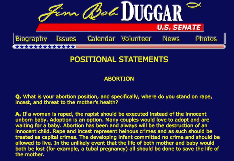 HERE IS A JUICY THING. Way back in 2002, when Jim Bob Duggar was running in the Republican primary for the U.S. Senate (and losing), the part of his campaign website labeled "abortion" said that no, ladies should not be allowed to abort their rape babies, but the rapist should be killed. Oh, and also that the "heinous crime" of incest should be a capital crime as well. Look what Defamer duggared up :