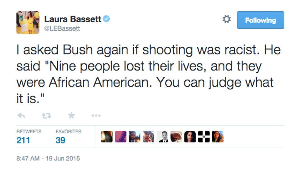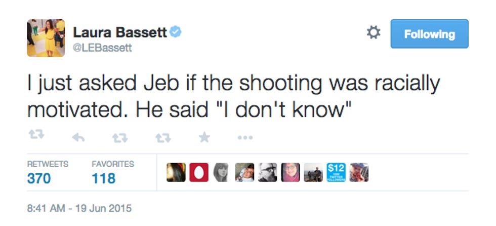 Really? People of all faiths should come together to love Christ, huh? Hey, what was that stuff Jeb's been saying lately about religious freedom? Oh yeah. Same thing they all say: You have the freedom to worship any god you want, as long as it's Jesus. That's the only way to mourn here in the land of the free. And while he doesn't know whether it's safe to call a racist crime a racist crime -- even though the killer himself has said that's what it is -- Jeb's quite certain he can speak for the dead.