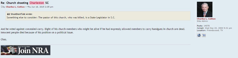 NRA board member Charles Cotton explained that Pinckney voted against concealed death weapons in churches, and therefore is the REAL killer: