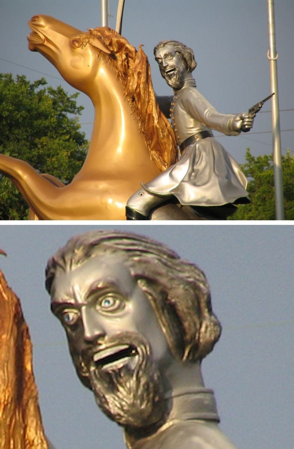We can get behind removing the bust, but agree with Gawker that the insanely bad sculpture of Forrest on private land near a freeway in Nashville should stay, because in its misshapen hideousness, it is "the most fitting monument to the ugly idiocy of southern history." Just look at this goddamned thing: