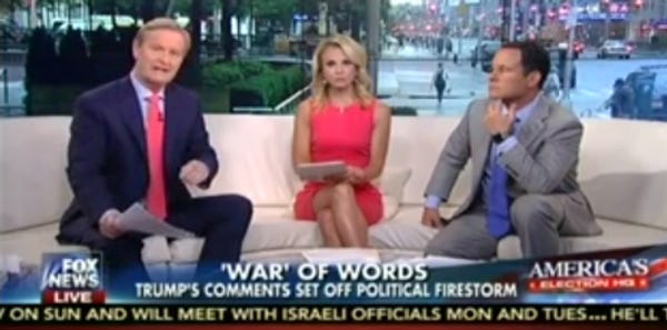 And how did the idiot cast of "Fox & Friends" -- Brian "The Rapey-Looking One" Kilmeade, Elisabeth Hasselbeck and Steve Doocy -- react to all this? The way they always do when Republican men talk all big, but are in reality giant pussies: They threw Trump's legs in the air and went to town on his Trump-hole, with their tongues.