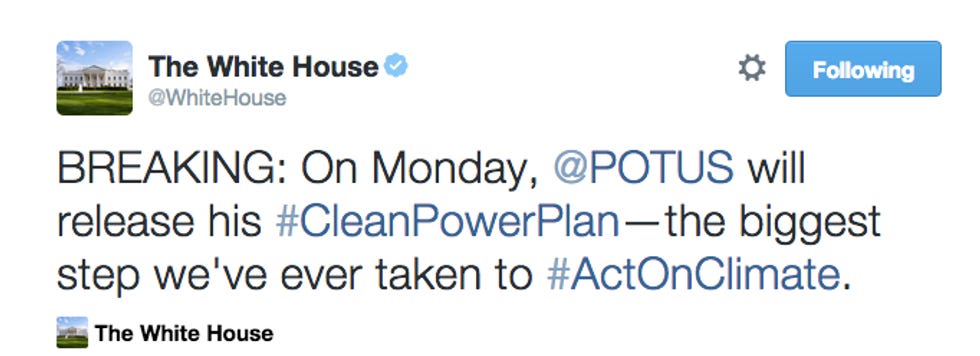 "Climate change is not a problem for another generation," the president says. "Not anymore." On Monday, he's releasing the final version of his Clean Power Plan, to regulate how much power plants may dirty up our air with carbon pollution. This, he says, is "the biggest, most important step we've ever taken to combat climate change." As you can imagine, Republicans are thrilled that the president is pursuing this plan and are so grateful he's looking out for their children and grandchildren, while they're busy shutting down the government over whatever they are mad about today. Just kidding! They are pissed and whining on the interwebs and will no doubt Make Speeches! and Send Emails! and Tweet Memes! because the president is blah blah Constitution whatever stuff words blah, we are SO BORED with the Republican temper tantrums after all these years, maybe get a new hobby?