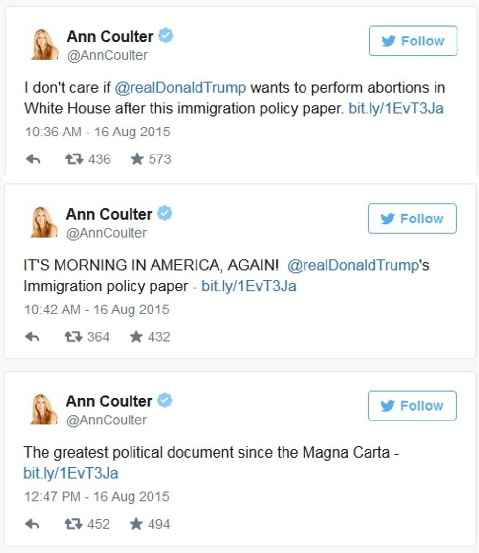 The plan was received with near-orgasmic delight by Trump's fellow performance artist-provocateur Ann Coulter, who is in such deep love that she wants to mate with the document and give birth to a whole litter of tiny position-paper/Coulter hybrids that would grow up one day to rule the ash-strewn remains of the North American continent: