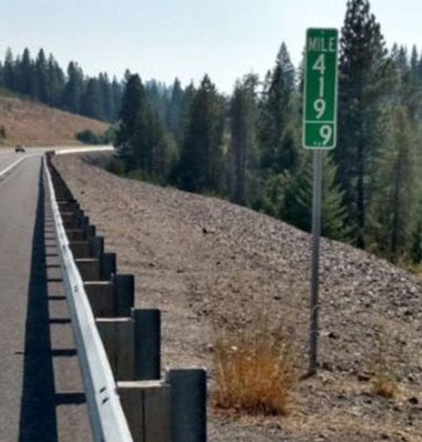 As best we can tell, the ITD hasn't actually relocated the marker a tenth of a mile away from the old one, which strikes us as the sort of sloppy work that could only result from a bunch of road workers who've been toking up. Maybe they should have followed the lead of Colorado, which went with the more accurate "Mile 419.99" when it made a similar swap last year.