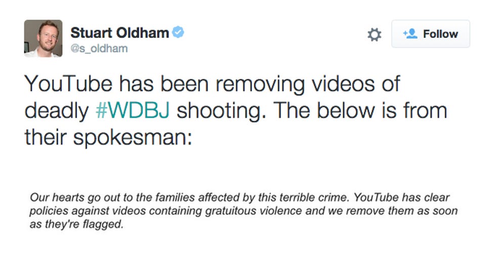 The murders were recorded, both by Ward, who was filming the live interview of Chamber of Commerce spokeswoman Vicki Gardner, who was also shot but is reported to be in stable condition, as well as by the suspect, who appears to have uploaded his first-person shooter video to Facebook and Twitter. Colleagues, friends, and family of the slain journalists have asked that the videos not be posted and auto-played and shared online to be Liked! or OMG'd with a sadface emoji. There is zero value in the mass consumption of these videos, and YouTube agrees: