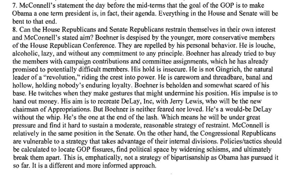 But then there's this breakdown of strategy for the 2010 midterm elections sent to Clinton by longtime Friend Of Billary Sidney Blumenthal, who is rather amused to see the GOP establishment trying to pivot from inviting the Palinistas in for the primaries, but to shut them out during the general (not that it ultimately mattered; the wackobirds showed up in droves and brought us a Permanent Dumbfuck Majority in the House). The fun stuff comes in Blumenthal's assessment of John Boehner's standing among his GOP peers, which is mostly that he serves as a pissing target: