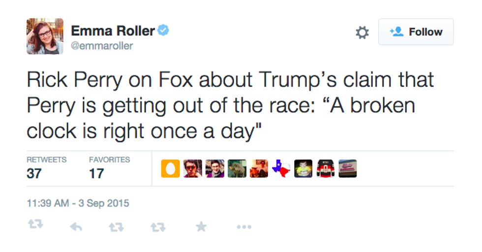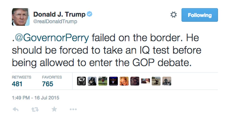 So yeah, there you have it. Yr Wonkette and Donald J. Trump are the only ones brave enough to say what we're all thinking, which is that Rick Perry's playtime is over, even if he doesn't realize it yet.