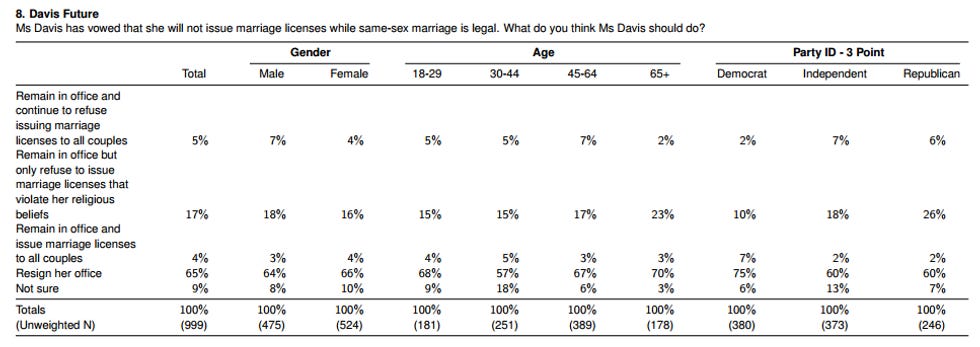 Let's start with YouGov, since, you know, "reputable" and stuff. Should Kim Davis have been put in jail and forced to trade french braid lessons for cigarettes, for failing to do her job? Why, 56 percent of Americans say YES! Even among Republicans, she couldn't muster majority support for living in the outside world: