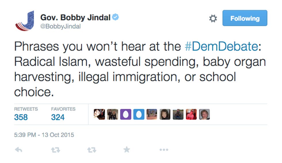 Guys, remember the Democratic debate on Tuesday night? You know, the one you missed because you were busy watching the Mets lose? Well, you can read all about it here, but spoiler: It was awesome. Two Democrats, a socialist, a bicurious dude from Rhode Island, and dickbag Jim Webb stood on a stage and delivered coherent thoughts, in complete sentences, and not one of them, not a single time, cried about the sharia threat of teenage Muslim science nerds, or whipped out their dicks to prove how much they will bomb Iran, or vowed to straight-marry Kim Davis as soon as she has an opening, or shook their angry fists of fury about BABY PARTS!!!!1!, all of which, to this idiot, Gov. Bobby Jindal, that was a bad thing: