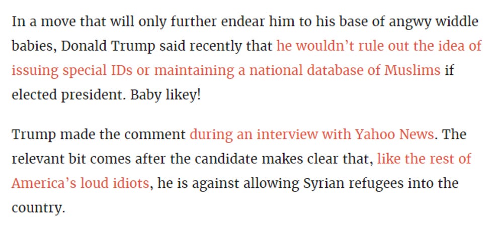 We need some context here. Because remember LAST TIME yr Wonkette yelled at Liberal Blogotubeville for saying Trump said a thing when he didn't actually say that thing? It was September, and over the course of an afternoon, it spread like WILDFIRE that Donald Trump had told his supporters he's going to kill all the Muslims. GREAT STORY! Except for how it wasn't true. A Trump supporter asked a crazy question about The Muslims -- "When can we get rid of ’em?" -- and Trump replied, QUOTE: