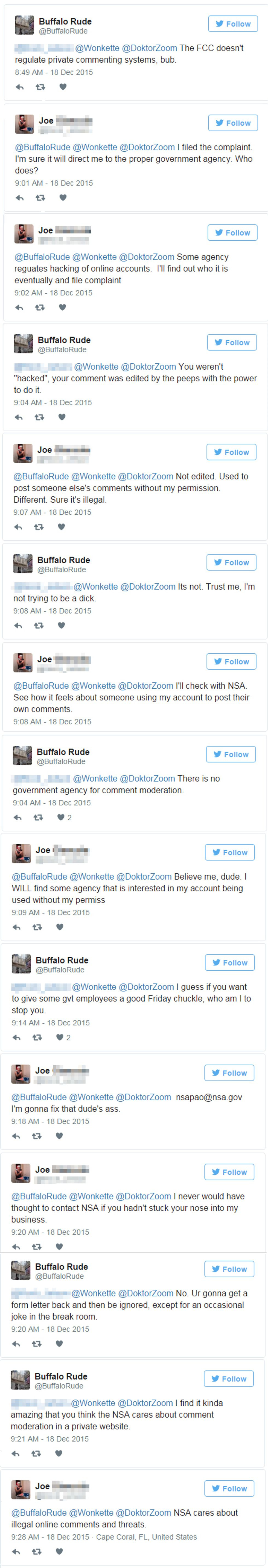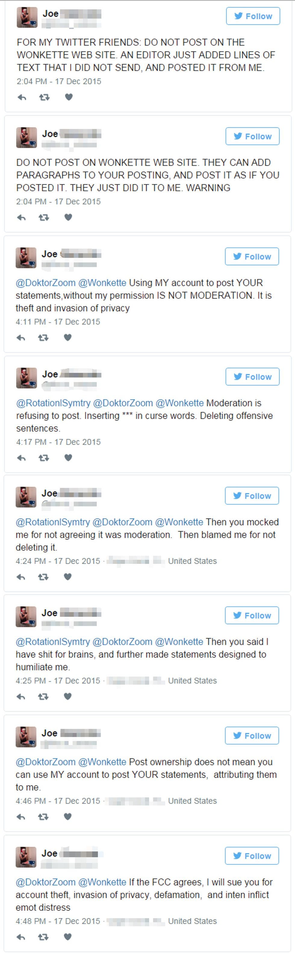 We should note that while we've made every effort to obscure "Joe's" identity in this post, he uses what appears to be a real name in his Disqus and Twitter accounts, and while we've had fun making light of his obsession with fixing our asses, we also want to make it absolutely clear that if we find out any Wonkette readers harass or threaten "Joe," we will permanently ban them from the site. The Rules apply to everyone, which is kind of what our point was in the first place.