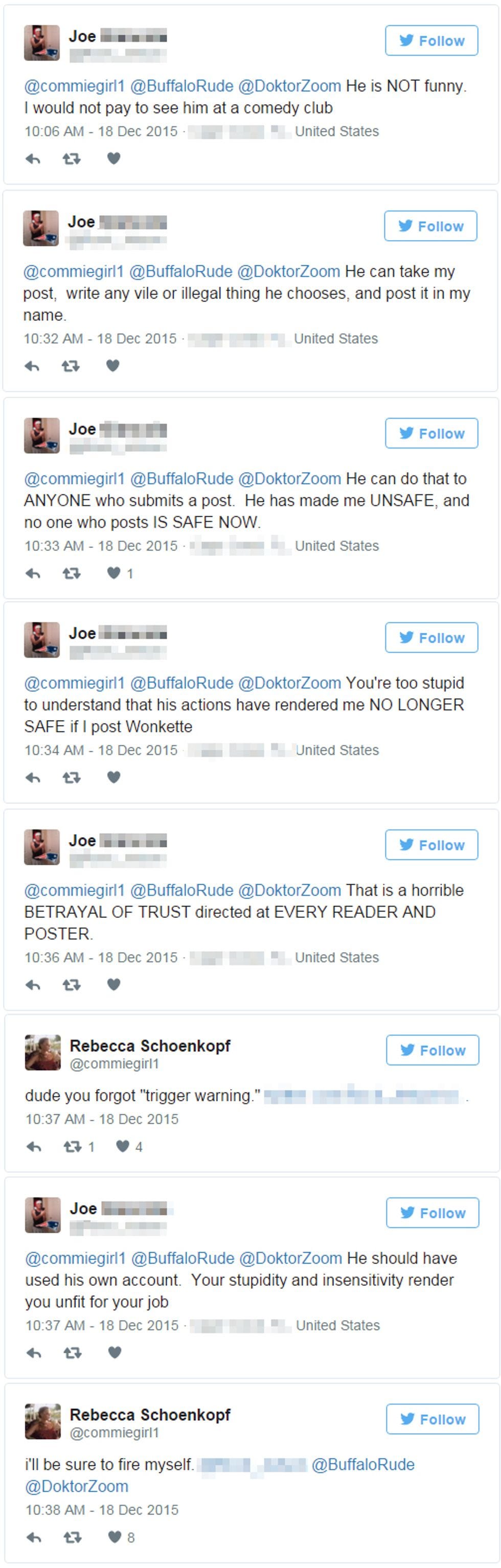 In the meantime, "Joe" had also mounted a multi-platform campaign to "warn" people that Wonkette is not a safe space. He added this grave advisory to almost every single one of our Facebook posts Thursday, even hijacking a post on the hung jury in Freddie Gray's murder:
