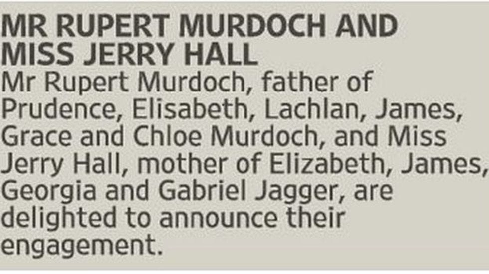 But now Rupert Murdoch has taken out an advertisement in a "news-paper" to announce that he is indeed sticking it in the leggy Texan, and he intends to put a ring on it (her vagina).