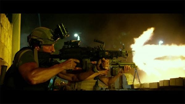 We jump back and forth between the six anxious heroes who could save the day if they're only unleashed, and the chaos at the compound, where some of the Libyan baddies take time out from their assault to fire AK-47s at the American Flag. This is what Michael Bay thinks is subtle symbolism. Spoiler warning: near the end of the film, the camera tracks through a window of the burned-out diplomatic villa and zooms in on the bullet-riddled flag floating with other charred flotsam in the swimming pool.