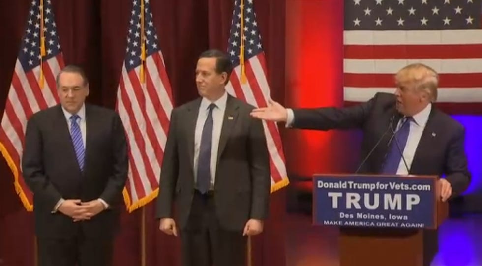 [contextly_sidebar id="rFzu5ldKaCcsuAF4bSHHmCvodxXgpoAo"]So Trump was down the street or whatever, pallin' around with veterans, and schmoozin' with undercard candidates Mike Huckabee and Rick Santorum, who probably just endorsed Trump, we don't know. It's not like their campaigns matter at this point: