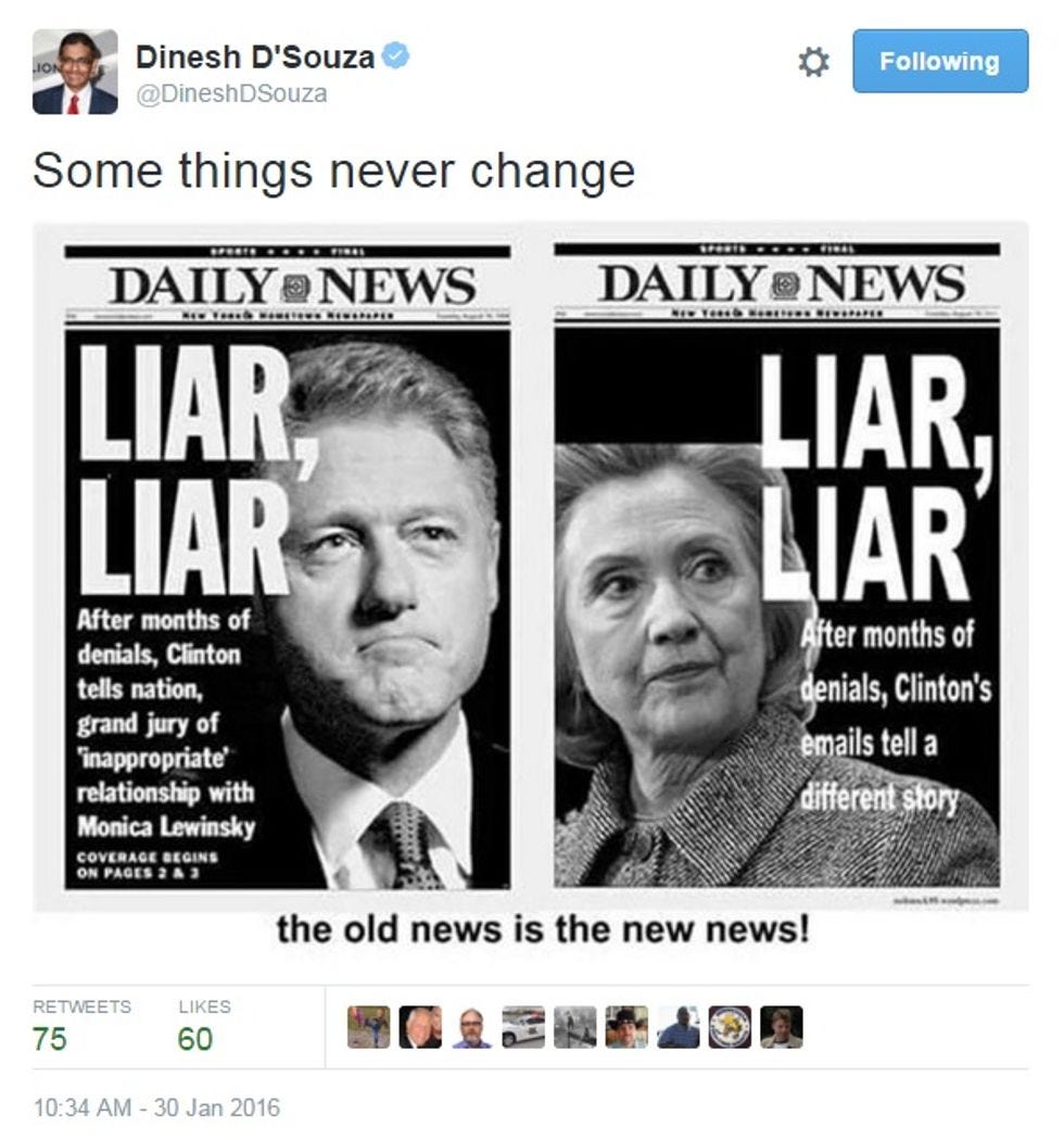 And then he'd find them a nice job at the Heritage Foundation. And actual convicted felon Dinesh D'Souza presents this really bad photoshop to prove that nothing ever changes: