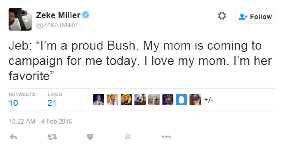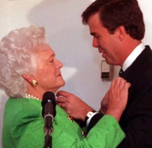 [contextly_sidebar id="oLLVcOFPYaprHuICqItEDfYIwqT0kGGg"]And do we all remember Mama Bush's recent supposedly "pro-Jeb" ad where she SEEMS to offer a full-throated endorsement of Jeb, except not at all? Quite to the contrary, she says he SEEMS better than the other candidates. She's not sure yet, though. For Christ's sake, she didn't even want him to run for president, so you know, Marco Rubio, call Barbara Bush maybe.