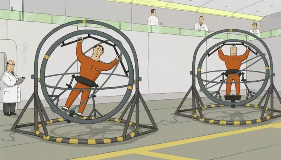 Take fifteen minutes to watch this beautiful animation by Konstantin Bronzit, "We Can't Live Without Cosmos," an Oscar nominee for Best Animated Short for 2016. It's the wordless story of two cosmonauts training for a mission, lifelong friends joined by their shared dreams of space. It's just plain joyful, is what it is. The New Yorker's Jonathan Rothman emailed Bronzit to ask what the film is about:
