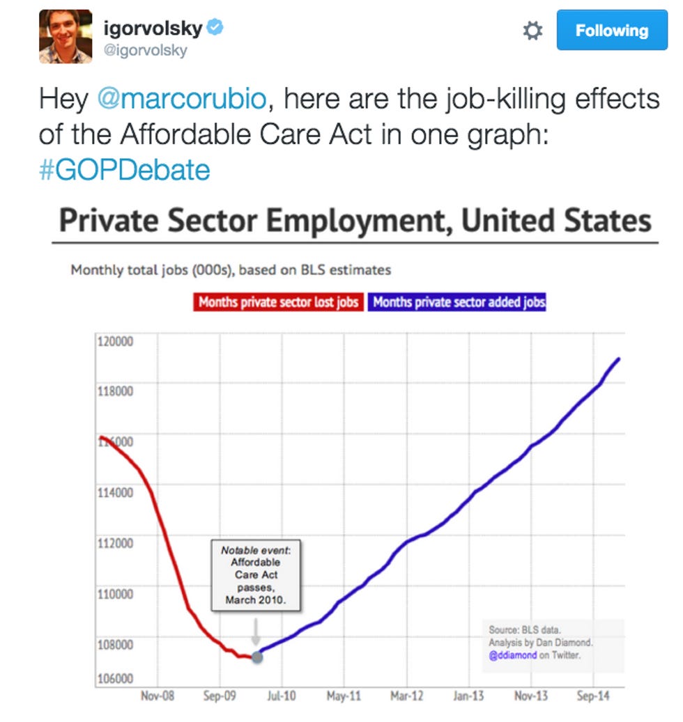 Take Obamacare, for example, which they all say they would repeal and set on fire and bury a hundred feet underground and then salt the earth. Marco Rubio trotted out that beloved GOP line -- which is a complete lie -- that Obamacare is a "job-killing law." It's not true. It's very easy to see that it's not true. It's not close to true, or up for debate, or a matter of opinion. It's just plain wrong :