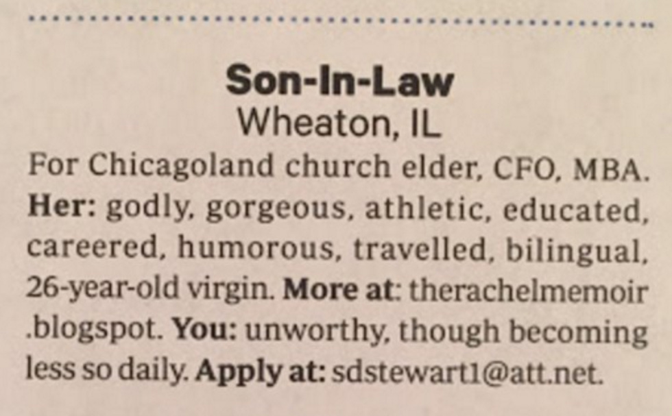 We learn from The Daily Beast that the as-yet-untouched gentlelady is named Rachel Stewart, and she takes all this in stride, saying in a now deleted blog post, "At least it’s appropriate they placed it in the Employment Opportunities section because putting up with this father-in-law's shenanigans is a full time job, without any paid vacation." Haha, glad she has a sense of humor -- just like it said in the ad! -- but WHY DO YOU STILL TALK TO YOUR PERV FATHER, RACHEL????