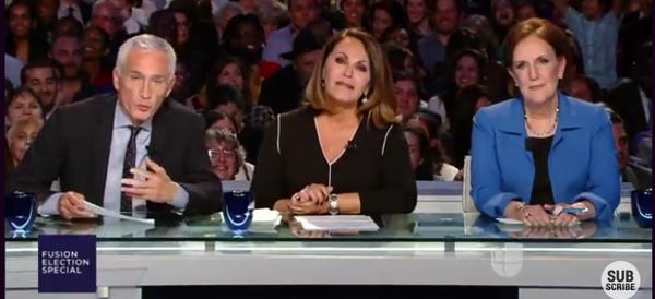 We're still trying to figure out what the hell happened last night. Did Bernie poison Maria Elena Salinas' dog? What member of Jorge Ramos's family did Hillary do Vince Foster to? We would make some crack about "when did Univision get taken over by Fox News," except we watched the last GOP Fox News debate, and the moderators in that one actually asked smarter questions than Univision did.