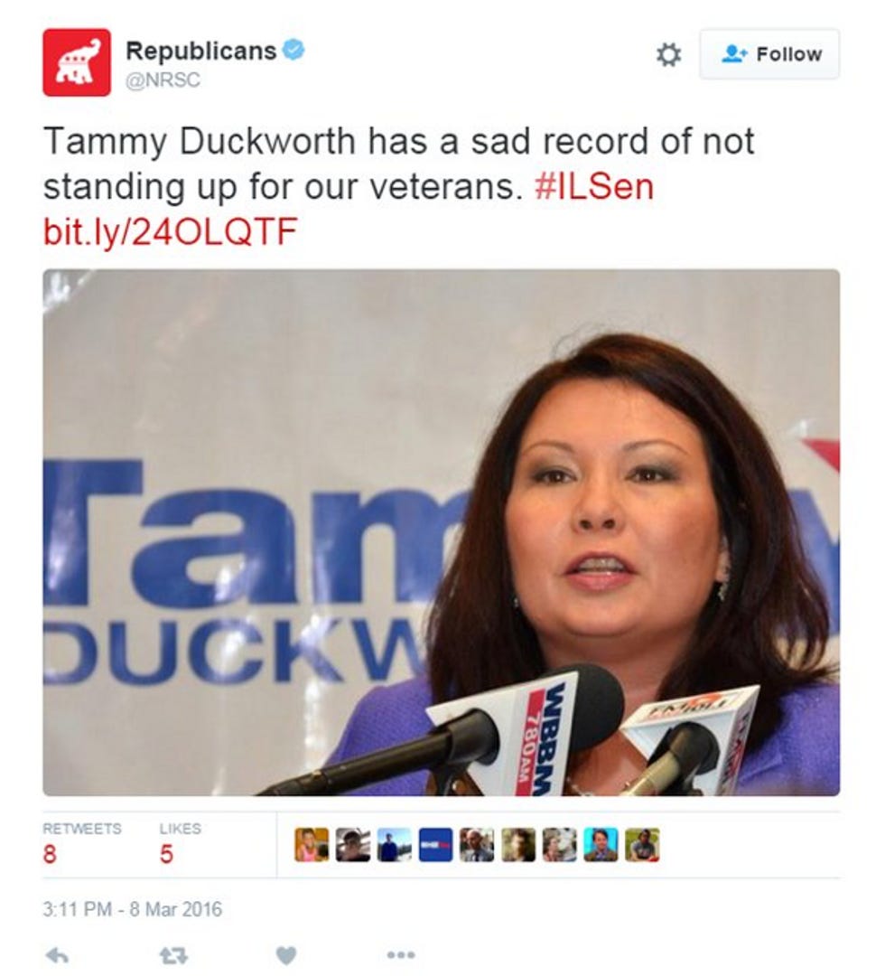 After winning reelection to the House in 2014, Duckworth announced last spring that she'd run against Illinois Sen. Mark Kirk, a race that is not going so great for Sen. Kirk. He probably wasn't helped last week by the NRSC's dumb tweet accusing Duckworth of "not standing up for our veterans."
