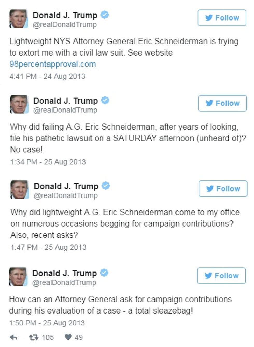 When the New York fraud suit was announced in August 2013, Trump accused Schneiderman of trying to shake him down for campaign contributions. He also attempted to try the case in his favorite venue, Twitter: