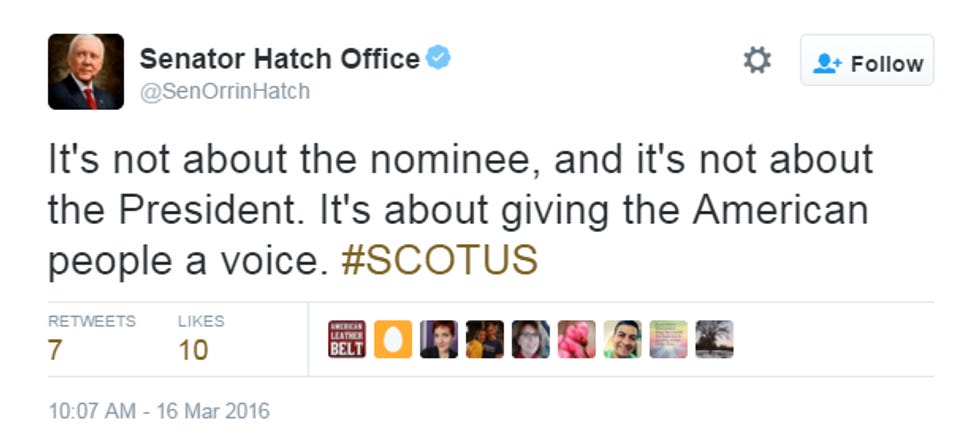 Hahahahaha, Orrin Hatch, how would you like to eat some of YOUR OWN WORDS with your Lunchables today? Of course, Sen. Hatch is a Republican, which means he's a craven, goalpost-moving cockweasel. So here's what he had to say on Tweeter about the unmitigated gall of the president of the United States nominating a Supreme Court justice: