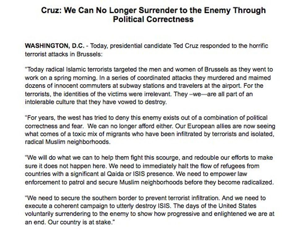 [contextly_sidebar id="l4v3PtU8u3x4i7cdFkqs2vLBbDNheyz2"]Ted Cruz's putrid mouth slit sure does talk a lot, especially for somebody who's never going to be president of any of his native North American homelands. When news of the Brussels attacks broke Tuesday morning, Cruz closed the internet tab where he was sex Skyping with Jesus and rushed to Facebook to issue a short, stupid two-paragraph statement that said "Radical Islamic Radical Terror Terror Islamic," or something along those lines.