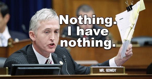 [wonkbar]<a href="https: //wonkette.substack.com/p/what-the-benghazi-hearing-taught-us-republicans-are-dicks-hillary-already-president"></a>[/wonkbar]And Rep. Trey Gowdy (R-Dumbass) KNOWS this happened. He just can't prove it. He admitted that his hilariously awful Benghazi hearings produced No New Information which would render Hillary #guilty. In fact, he just ended up looking like a whiny ass titty baby, and made Hillary look Presidential As Fuck. But Gowdy didn't give up. He is still investigating Benghazi, because one of these days, he's going to find his smoking gun and YOU'LL SEE!