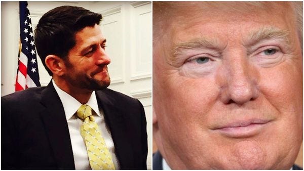 There's a battle of halfwits going on right now, between presumptive Republican nominee Donald Trump and the pinchable face cheeks of House Speaker Paul Ryan. Ryan's been waffling back and forth on Trump, saying he doesn't like it for the GOP frontrunner to be such an unhinged egomaniacal racist, but never actually saying he won't support him. But then last week, he started dipping his dick in the Trump waters, saying, oh well, we "come from the same principles." Could there be love on the horizon?