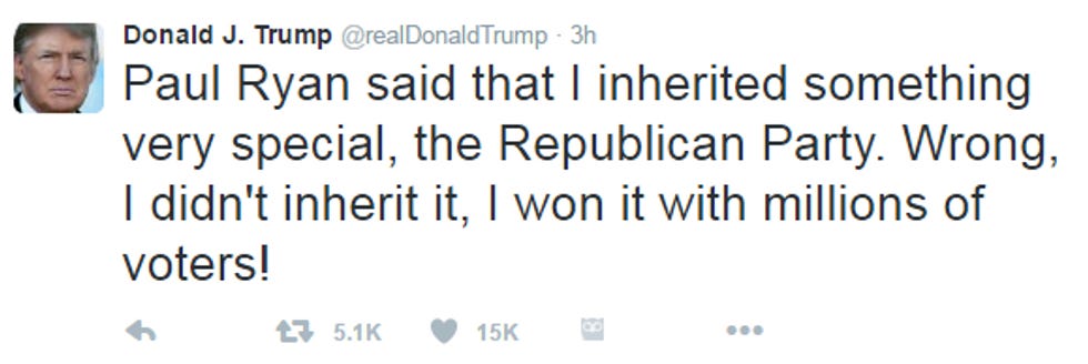 Well, would you possibly believe that Donald Trump was not happy with this idea that he "inherited" the party, and that he took to Twitter to bitch about it? UNPOSSIBLE, we know, but that has happened: