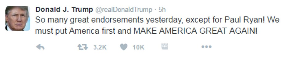 And would you believe Trump is just real pissy, in general, about how Paul Ryan is being such a hard-to-get prick-tease, and that he bitched on Twitter about that too?