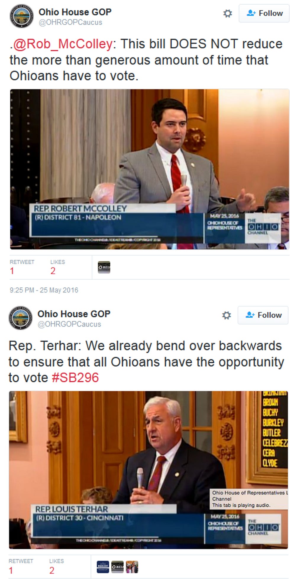 Yes ... and your point, lady? It's really quite simple: If you go and let just anyone vote, you might not get the results the Republican majority in the Ohio legislature wants, and that would not be fair. The Republicans are all about fairness, as these tweets from the Ohio House GOP prove: