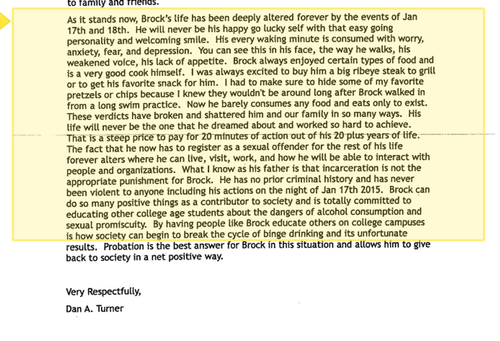 I told the probation officer I do not want Brock to rot away in prison. I did not say he does not deserve to be behind bars. The probation officer’s recommendation of a year or less in county jail is a soft timeout, a mockery of the seriousness of his assaults, an insult to me and all women. It gives the message that a stranger can be inside you without proper consent and he will receive less than what has been defined as the minimum sentence. Probation should be denied. I also told the probation officer that what I truly wanted was for Brock to get it, to understand and admit to his wrongdoing.