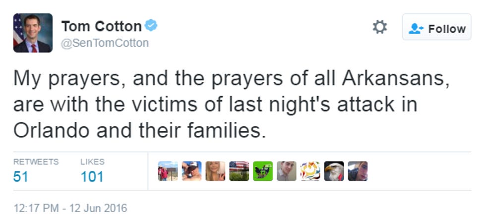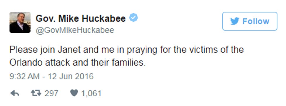 Other Republicans know what to say! They know we should all bow our heads in prayer for the victims of this senseless attack, but none of them see fit to mention who those victims were, or that Republicans have fought like hell for decades to deny basic rights to those very victims. Here, have a couple tweets: