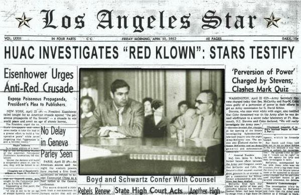 Ah yes, the House Un-American Activities Committee! That sure isn't a black mark on America's soul or anything! That went really well! No one is embarrassed by that! Remember what a good time it was when all those people were banned from working in Hollywood because some people thought they might be COMMIES? That, friends, was when we first learned the true character of one Ronald Reagan, who gleefully "named names" during the investigation.