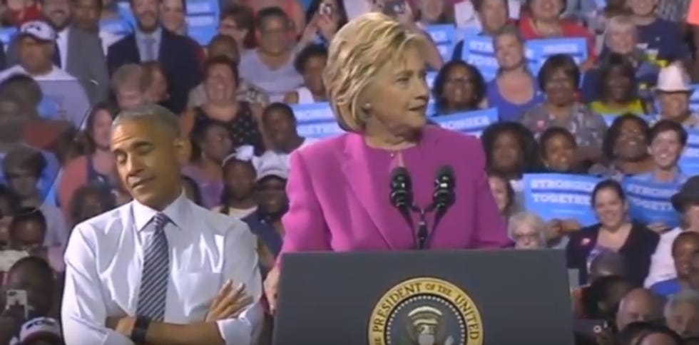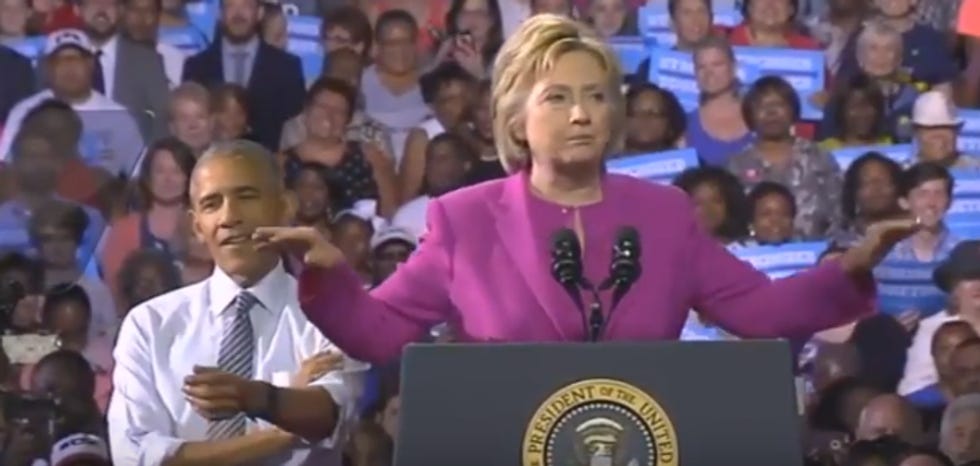 And here is Hillary being serious for a minute, because Obama is saying the very nicest things about her, like how she is running for president for the same reason he did. (Who knew Obama ran for president so he could do Benghazi a million times with his emails?)
