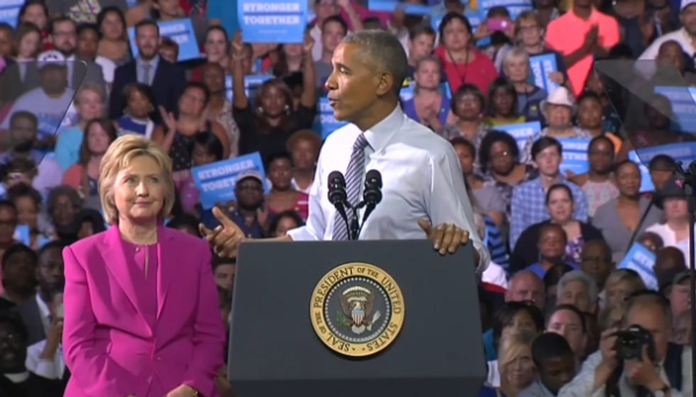 Anyway, the point of this post is that ooh girl you can just TELL how excited Hillz and Bamz are to finally be able to campaign together. Obama explained that it doesn't matter if you are white or black, Hispanic or lesbian, or even if you are covered in polka dots (HE SAID THAT), Hillary is the best choice for you, whether you are worried about the economy or the ISIS or the guns or the gay stuff. He is the president of you, and he is an #ImWithHer, so you should be too!