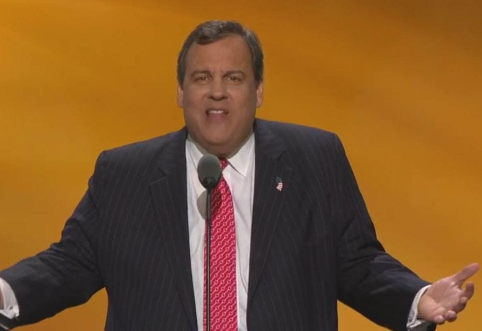 Throughout Christie's long-winded political theater, he only actually mentioned Trump twice. If that sounds familiar, it's because he did the same petulant crap at the 2012 convention when he huffed, and he puffed and he refused to go on stage unless the RNC played his little self-aggrandizing jack-off tape. He was all bitching that Romney picked Ryan as his Veep, so Christie slapped his chum guzzler together for almost 30 minutes in protest.