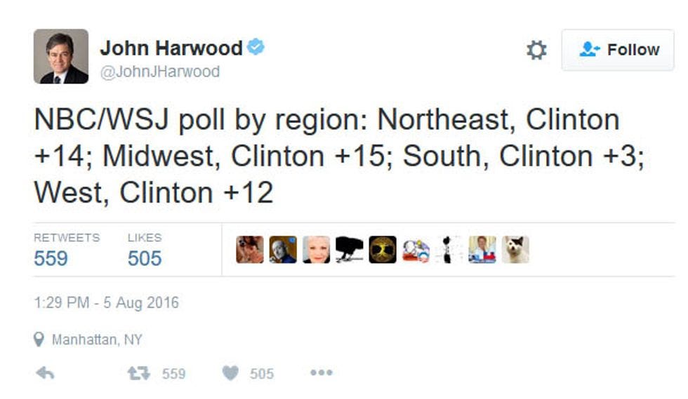 Here, have an NBC/WSJ poll ! Nowhere in it does it divide up by "region" (we looked real good!) but this CNBC guy, John Harwood, seems to have received some extra special data, like.