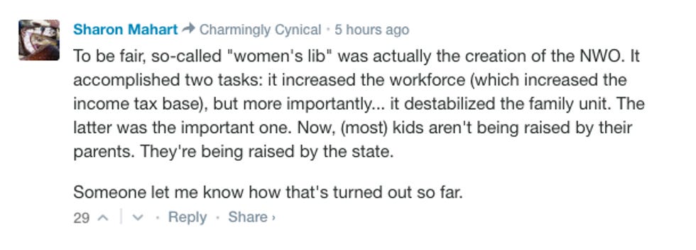 It is really nice of Milo to think about our happiness! Obviously, women are SO STUPID that we cannot even figure out what would make us happy, and we need a man to tell us what would. And we can't even say to ourselves "Hey! I sure would be happy if we didn't have a washing machine and birth control, perhaps I will not have a washing machine or go on birth control!" No, they must be forcibly taken from us. For our own good.