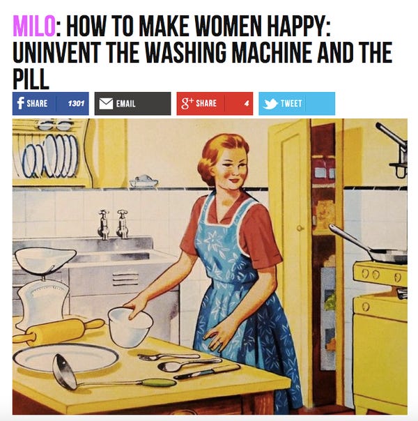 HEY LADIES. Did you know that you are very unhappy these days? It's true! At least according to Breitbart, a website that is in no way sexist or racist at all. But thankfully, alt right columnist and loud and proud Trump supporter Milo Yiannopoulos has figured out what will make us happy, and it is having to do laundry by hand and not being able to have sex without worrying about getting pregnant.