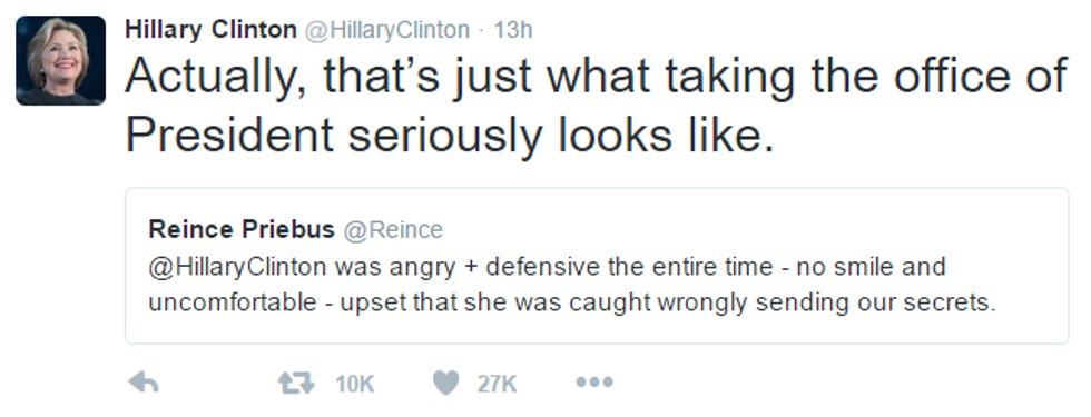 In Thursday morning's press conference, Hillary said, "I don't take my advice or take seriously anything that comes from the RNC," and that she would let people figure out by themselves if they are sexism-ing her. She also added this HILARIOUS ZINGER about smiles: