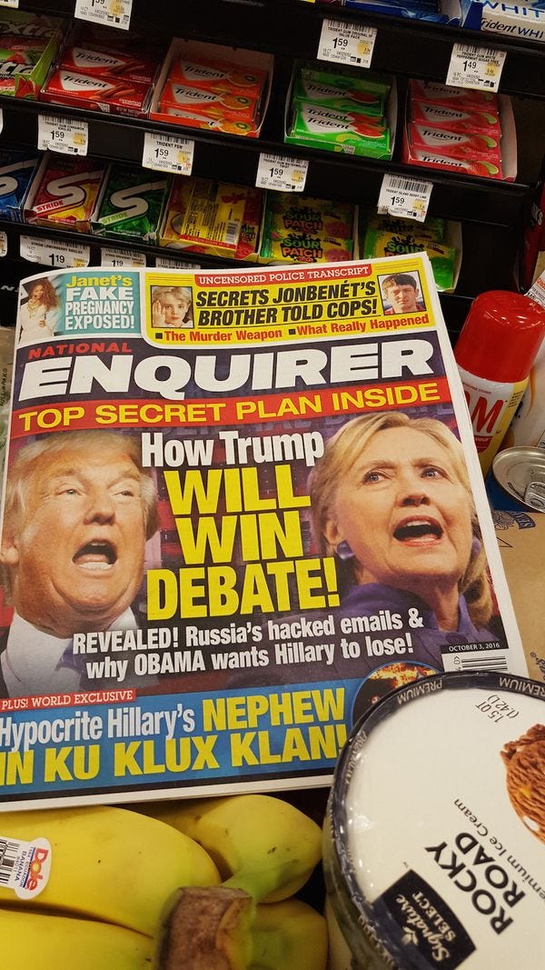 The rules for tonight's Wonkette Debate Liveblog Drinking Game have been brought to you by this National Enquirer I just bought. Each time Donald Trump does one of the 10 elements of Donald Trump's Top Secret Plan To Win The Debate, as presented by this National Enquirer I just bought, you will drink. THEN WE WILL ALL DIE OF ALCOHOL POISON. But before we do that, we should inform you that also according to this National Enquirer I just bought, Bill Clinton's stepsister's son was super into the Klan before he died 10 years ago, and this makes Hillary Clinton -- who, according to the National Enquirer, never met Bill Clinton's stepsister's son -- a hypocrite. For thinking racism is bad.