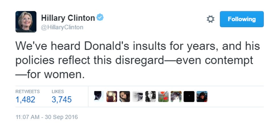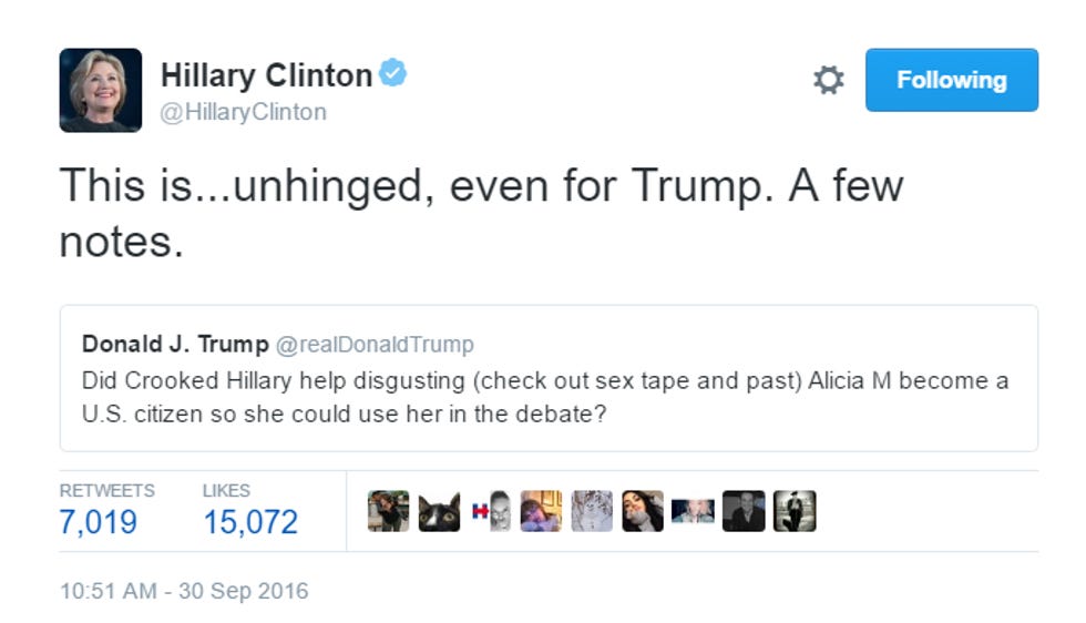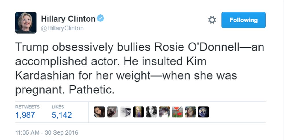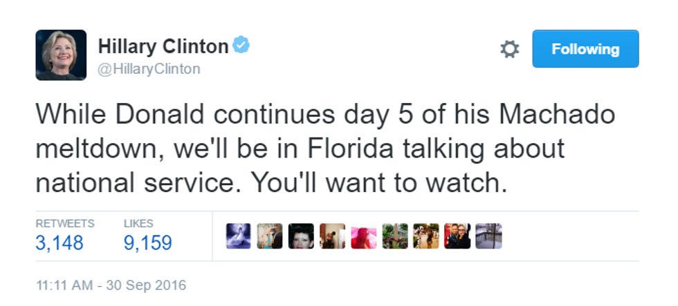 Hillary Clinton is now eight tweets in, and she's sorry she has to cut this short, but she's got somewhere to be, because she's the only grown-ass adult in the presidential race right now. Let her depart from Donald's company by throwing one metric fuck-ton of shade: